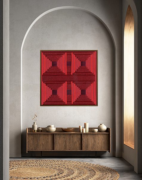 Carolina De Jesus is a textile artist who expresses emotion through intense colour and intricate design. While training at Chelsea College of Art she began to experiment with winding threads, discovering in the technique the potential for complex and dynamic three-dimensional patterns. Her artworks are richly textured with shimmering colour.